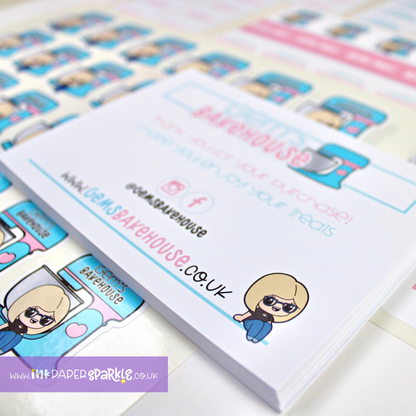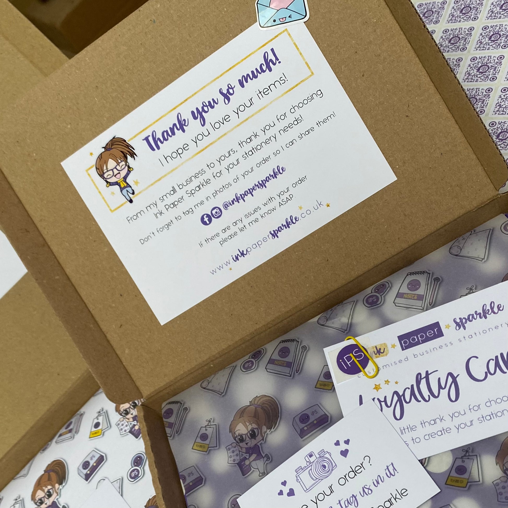 These thank you slips are printed single sided on brilliant white 160gsm uncoated paper and measure approx 10.5 x 15cm (A6).