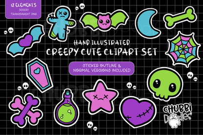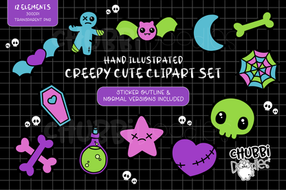 This creepy but cute graphics collection features 12 different hand illustrated images - with and without the white sticker outline. Perfect for adding to your social media posts, making your own planner stickers, use in sublimation prints, wall prints, greetings cards, party invitations and lots more!