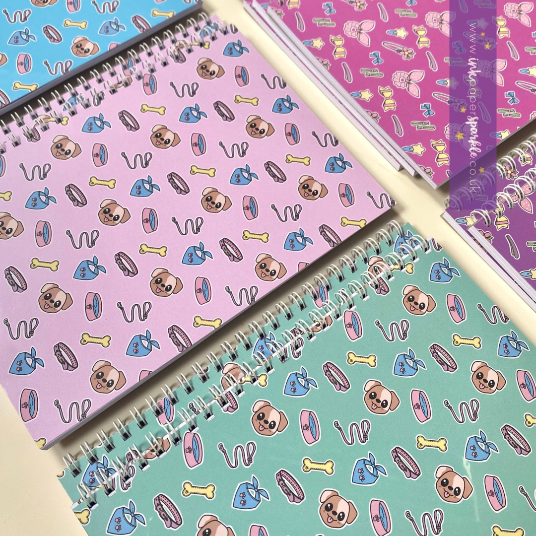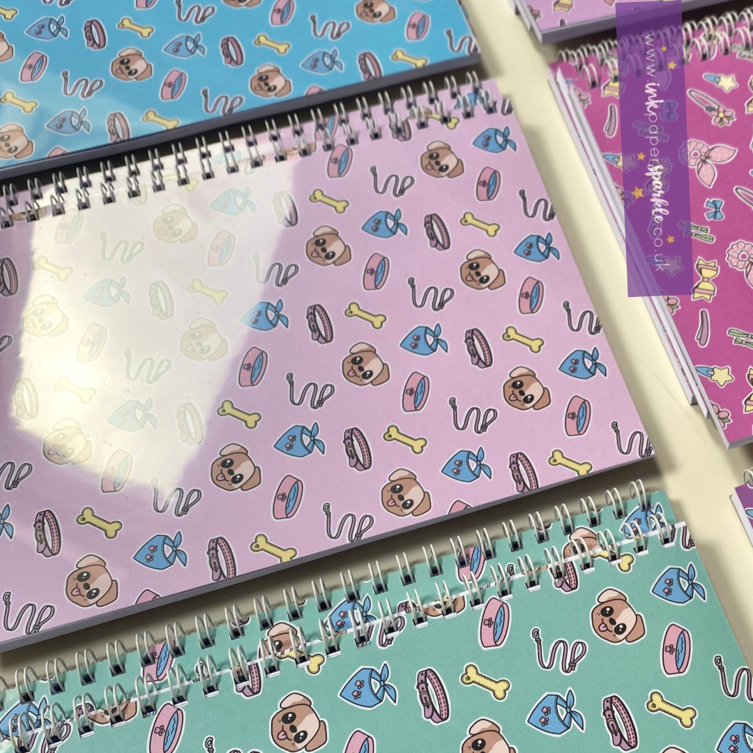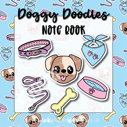 A5 notebook covered in super cute dog accessory doodles! Perfect for dog based businesses or anyone who loves dogs!