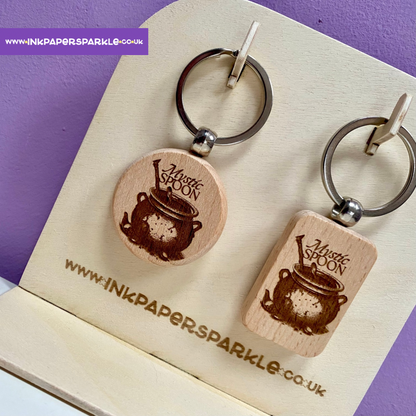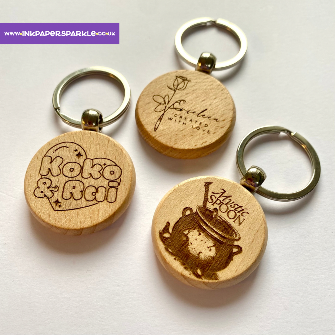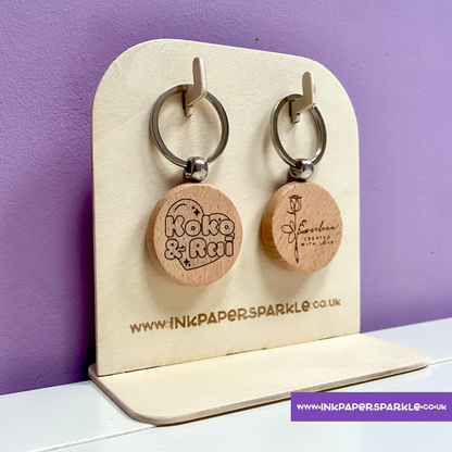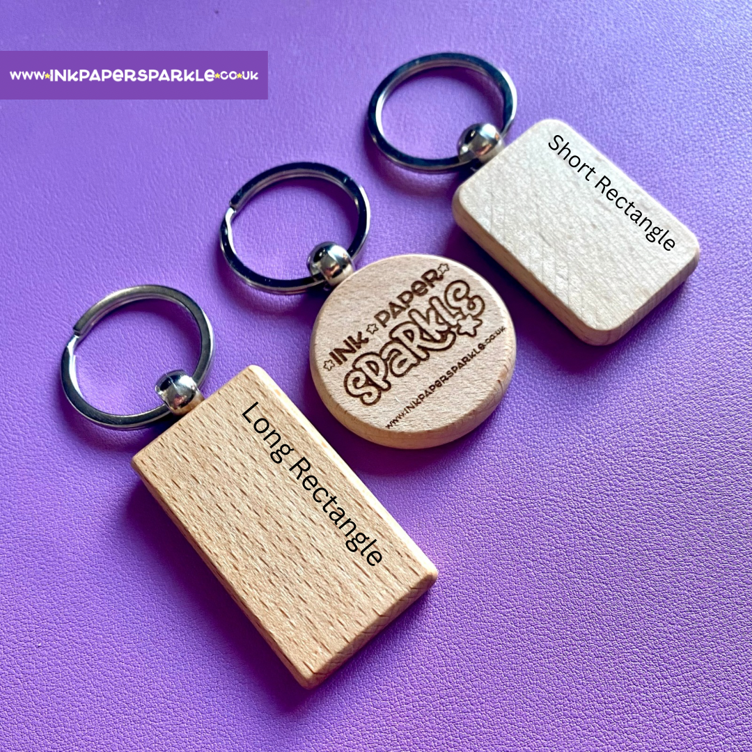 These wooden laser engraved keyrings are available in 3 shape options. Silver coloured split ring & hardware.