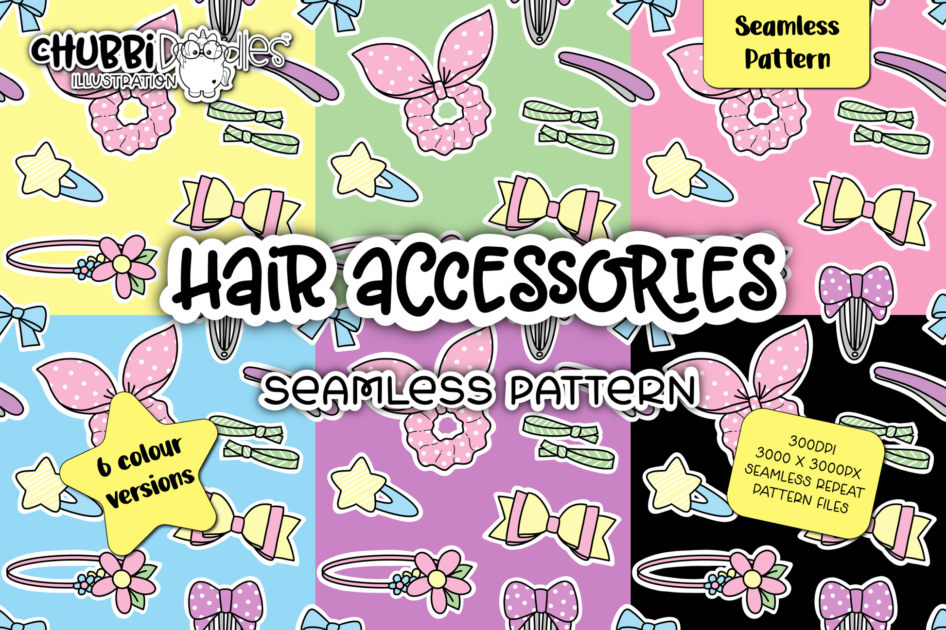 This pattern features cute hair accessory hand illustrated images and comes with 6 different background colour variations.
