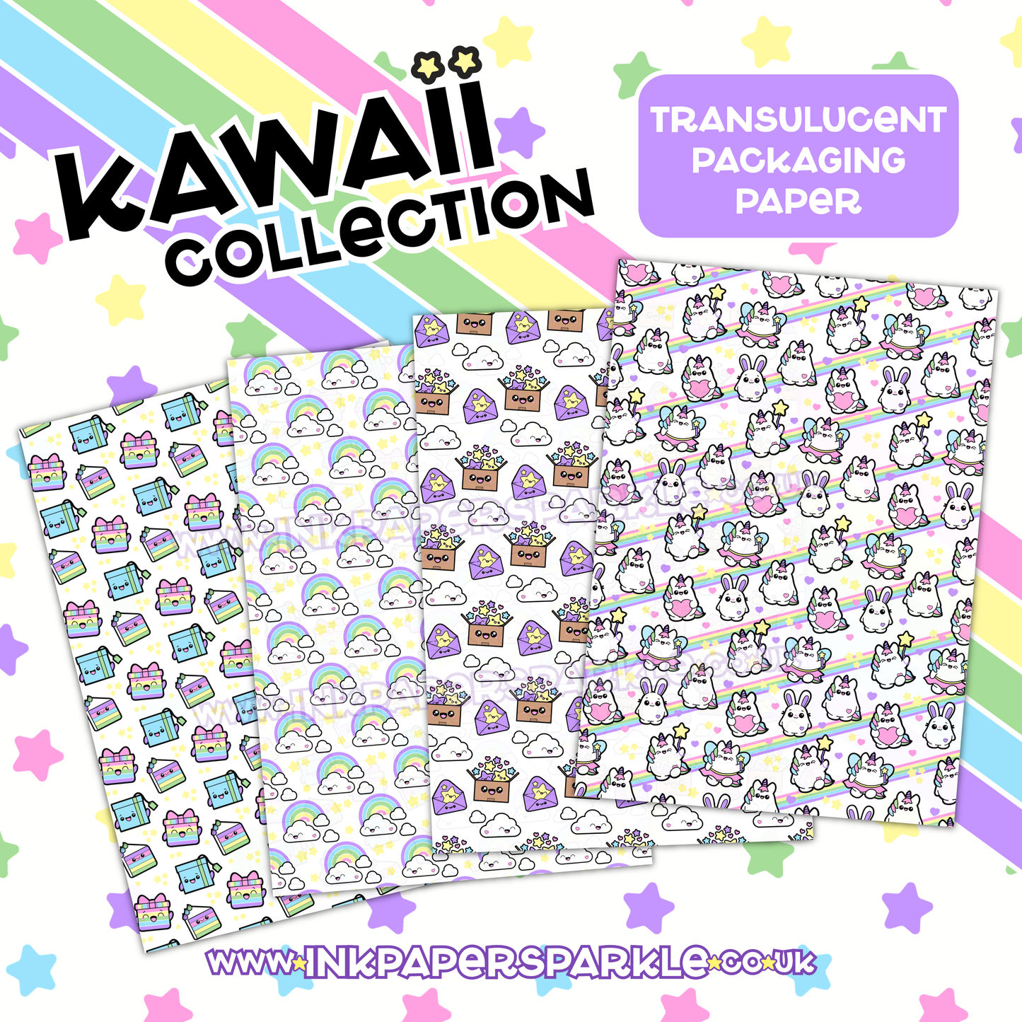 Thicker than tissue paper, this 65gsm translucent paper can be printed edge to edge with these fun kawaii characters. It's perfect for wrapping your products or lining the inside of boring plain boxes.