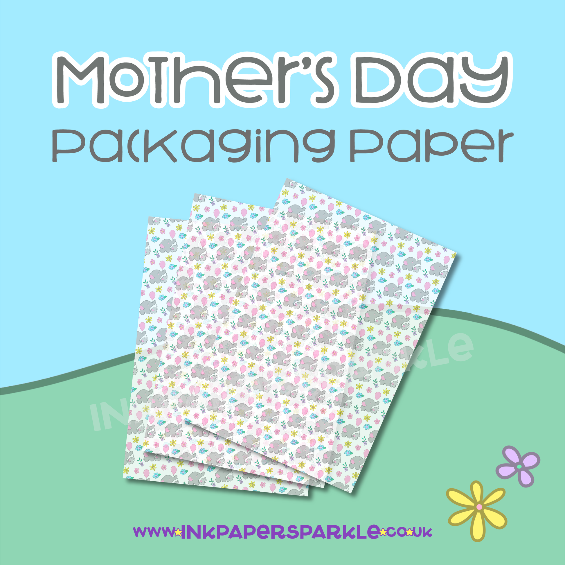 Thicker than tissue paper, this 65gsm translucent paper is printed edge to edge with cute Mummy & Baby elephants and pretty flowers. It's perfect for wrapping your products or lining the inside of boring plain boxes.