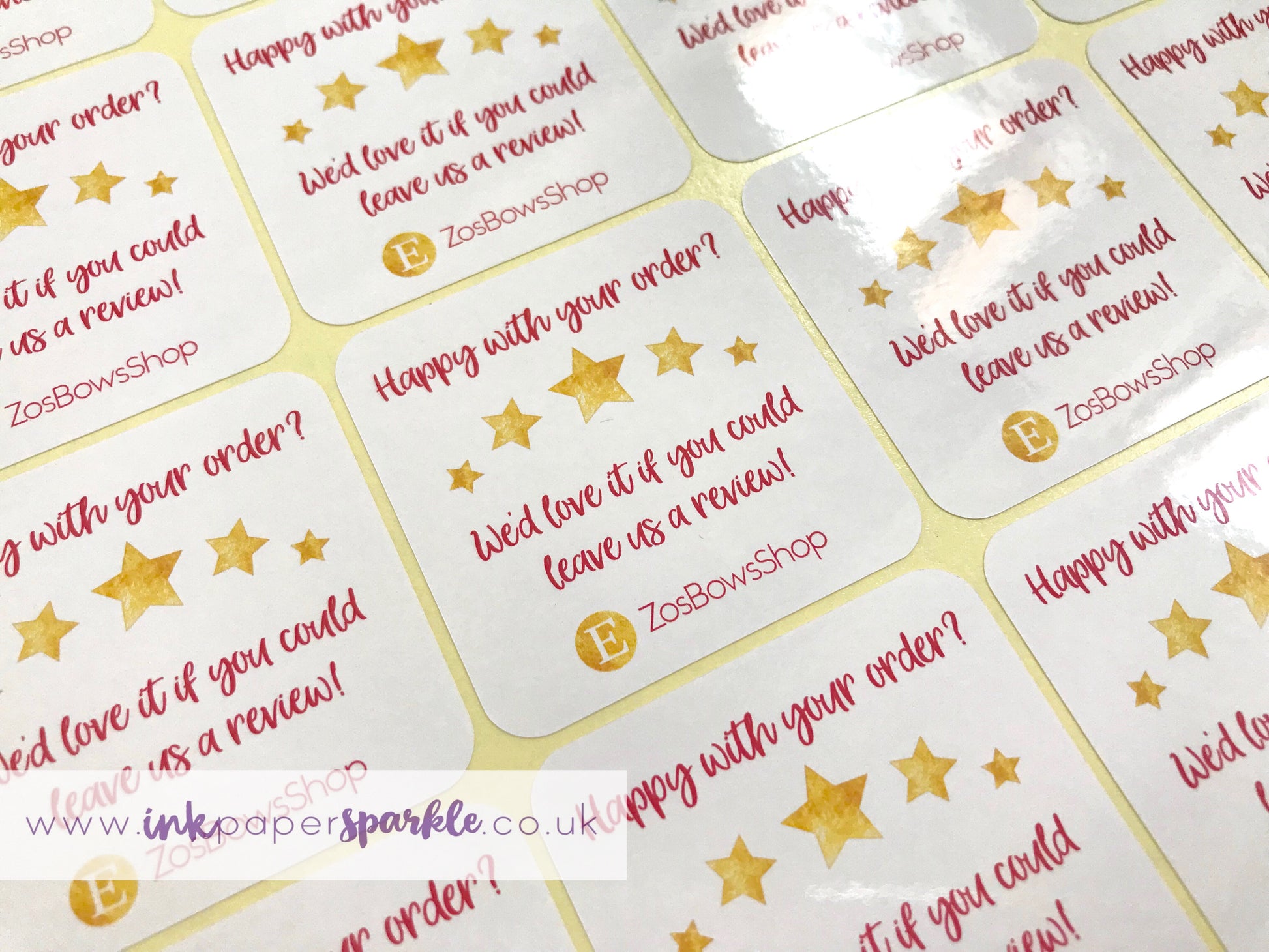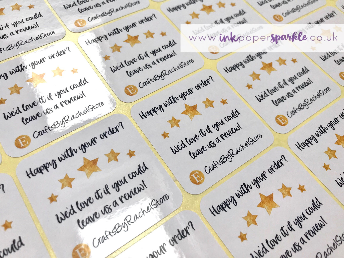 Encourage your customers to leave you a review with these glossy 44mm square stickers.
