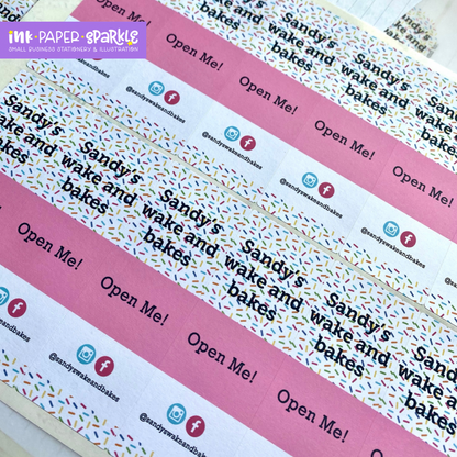 Sheets of 99mm x 38mm rectangular matt finish paper box seals.